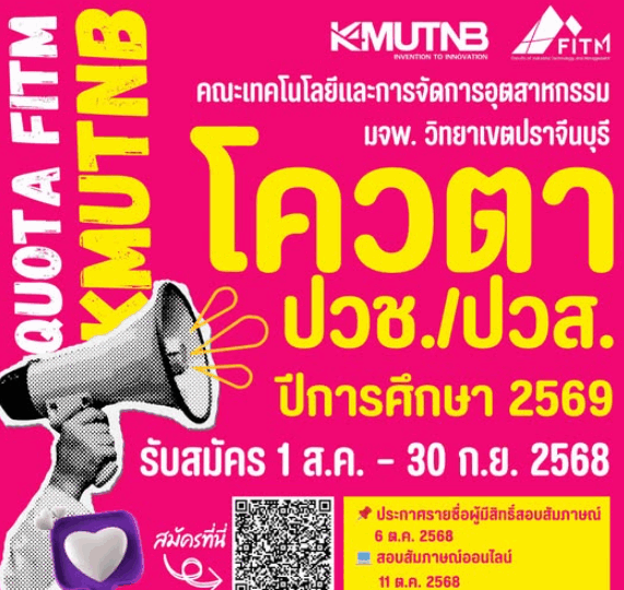 คณะเทคโนโลยีและการจัดการอุตสาหกรรม(FITM) มหาวิทยาลัยเทคโนโลยีพระจอมเกล้าพระนครเหนือ (มจพ.) วิทยาเขตปราจีนบุรี เปิดรับสมัครแล้ว! โควตา ปวช./ปวส. ปีการศึกษา 2569 สำหรับนักศึกษาที่กำลังศึกษาอยู่ในระดับ ปวช. หรือ ปวส. เพื่อศึกษาต่อระดับปริญญาตรี ในหลักสูตรระดับปริญญาตรี 4 ปี (สำหรับนักเรียน ปวช.), ระดับปริญญาตรี (ต่อเนื่อง) 2 ปี (สำหรับ ปวส.), ระดับปริญญาตรี (เทียบโอน) 2 ปีครึ่ง และ ระดับปริญญาตรี (เทียบโอน) 3 ปี รายละเอียดังนี้